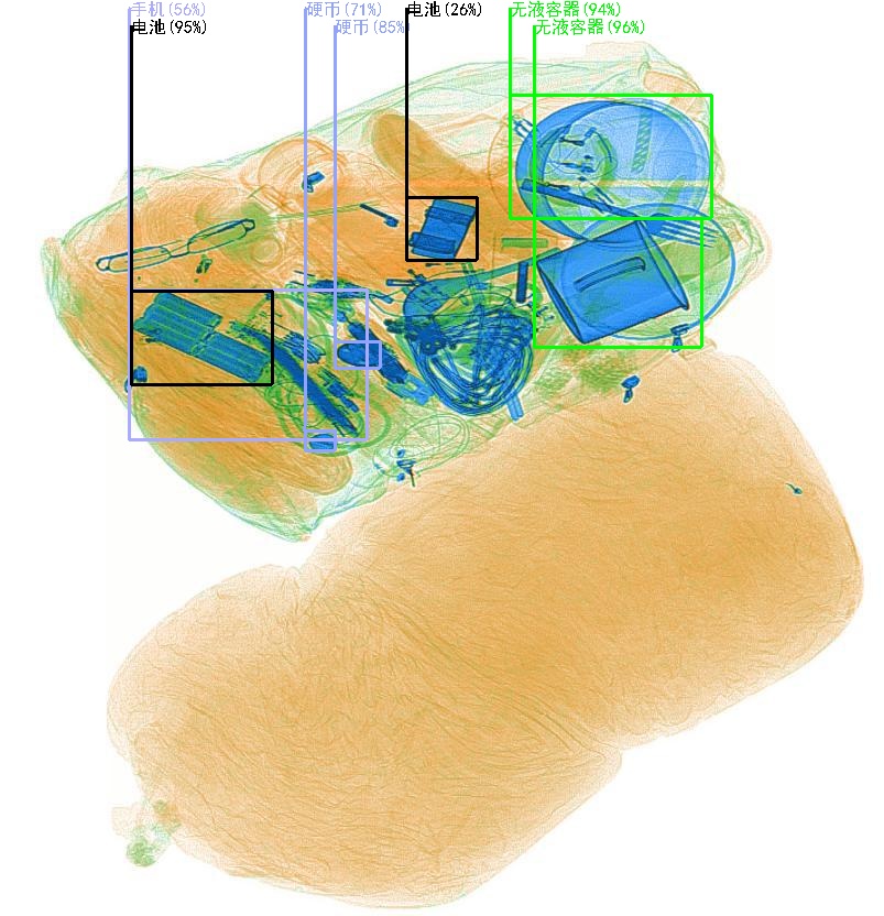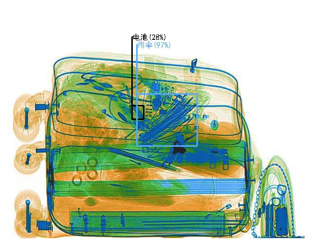 通过深度学习算法,将安检图片结构化,智能识别图像中的违禁物品,如:刀、枪、瓶子、雨伞、电池、手机、笔记本电脑、喷灌、剪刀等。并可以通过分级联动输出(不同种类危险品关联不同的联动方式:蜂鸣器,报警输出),提示可疑物品出现。