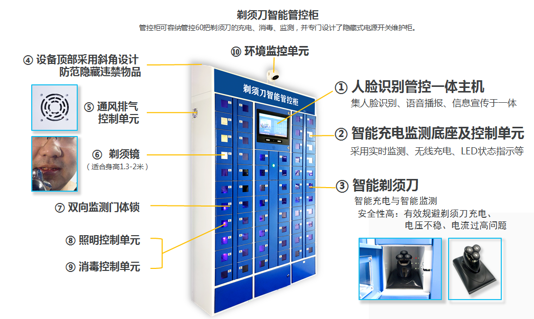 半岛电竞_半岛电竞(中国)剃须刀智能管控柜由管控机柜、人脸识别管控一体机、监测门体、无线充电监测控制单元、照明控制单元、消毒控制单元、通风排湿控制单元、剃须镜、环境监控摄像头、智能管控系统等组成。